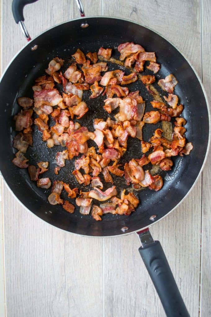 Let me tell you, it is so super easy to make that you will be amazed that something so versatile and delicious could be so simple. Start by cutting up a pound of bacon into 1 inch pieces and frying it all up in a large skillet. Cook the bacon until it is done, not crispy but browned.