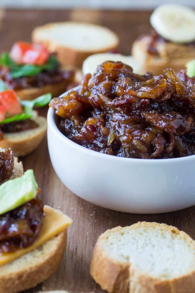 The short answer to that question is… the possibilities are endless. Whatever you might like bacon on, you can add this spread instead. Peanut butter banana bacon sandwiches.. YES! Bacon Lettuce and Tomato appetizers… YES! Baked brie and Slow Cooker Bacon Jam on toasted bread … YES! Slow Cooker Bacon Jam off a spoon right out of the slow cooker… YES YES YES!!!
