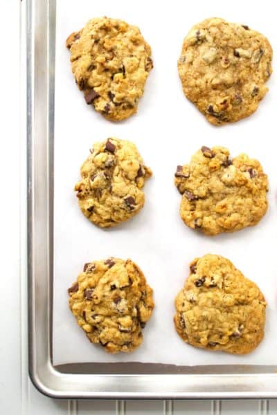 - Using a 1/4 cup measuring scoop (yes, these are big!) drop large scoops of cookies onto the cookie sheet, leaving 2 inches of space in-between each of the cookies