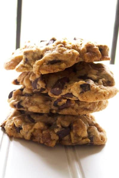 Hello.. hello.. hello..? Is this thing on? I have three words for you. Best. Cookie. Ever! And what I am yelling about when I say best cookie EVER are these Chunky Monkey Cookies.  Chunky Monkey Cookies are soft banana cookies bursting with dark chocolate chunks, tons of walnuts and because they are so freaking good… they are twice the size of your average sized cookie. That’s cookie nirvana!!