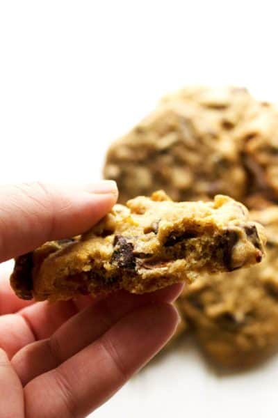 Easy! To make your Chunky Monkey Cookies, preheat oven to 325 degrees and line a cookie sheet pan with parchment paper. Start by adding butter to a large mixing bowl and beat with an electric hand mixer until fluffy. Add sugar, egg, egg yolk, salt, brown sugar, sugar and vanilla to the bowl and mix util well combined. In a separate bowl, sift together the flour and baking soda and then incorporate slowly into the butter/sugar batter. Once everything is combined, fold in chocolate chunks, banana and walnuts until mixed. Using a 1/4 cup measuring scoop (yes, these are big!) drop large scoops of Chunky Monkey Cookies onto the cookie sheet, leaving 2 inches of space in-between each of the cookies. Bake Chunky Monkey Cookies for 20-22 minutes (they will still be very soft so be gentle!). Remove from oven and let cool on cookie sheet 1 minute before moving the cookies to a cooling rack.