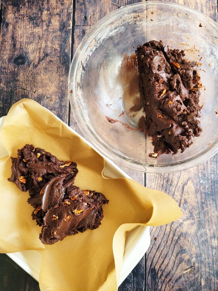 - Dividing Batter – When the batter is still in the bowl, I even it out as best as I can and then simply run the edge of my spatula right down the middle to make sure my brownie layers will be even.