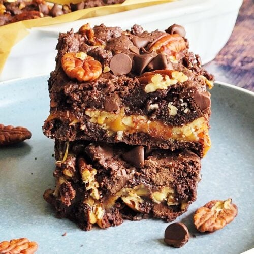 Bake & Cool: Bake for 30 minutes. Remove from oven and sprinkle with remaining chocolate chips. Let cool completely on a cooling rack before removing them from the pan and slicing. Your turtle brownies can then be moved to an airtight container and stored on your counter top.
